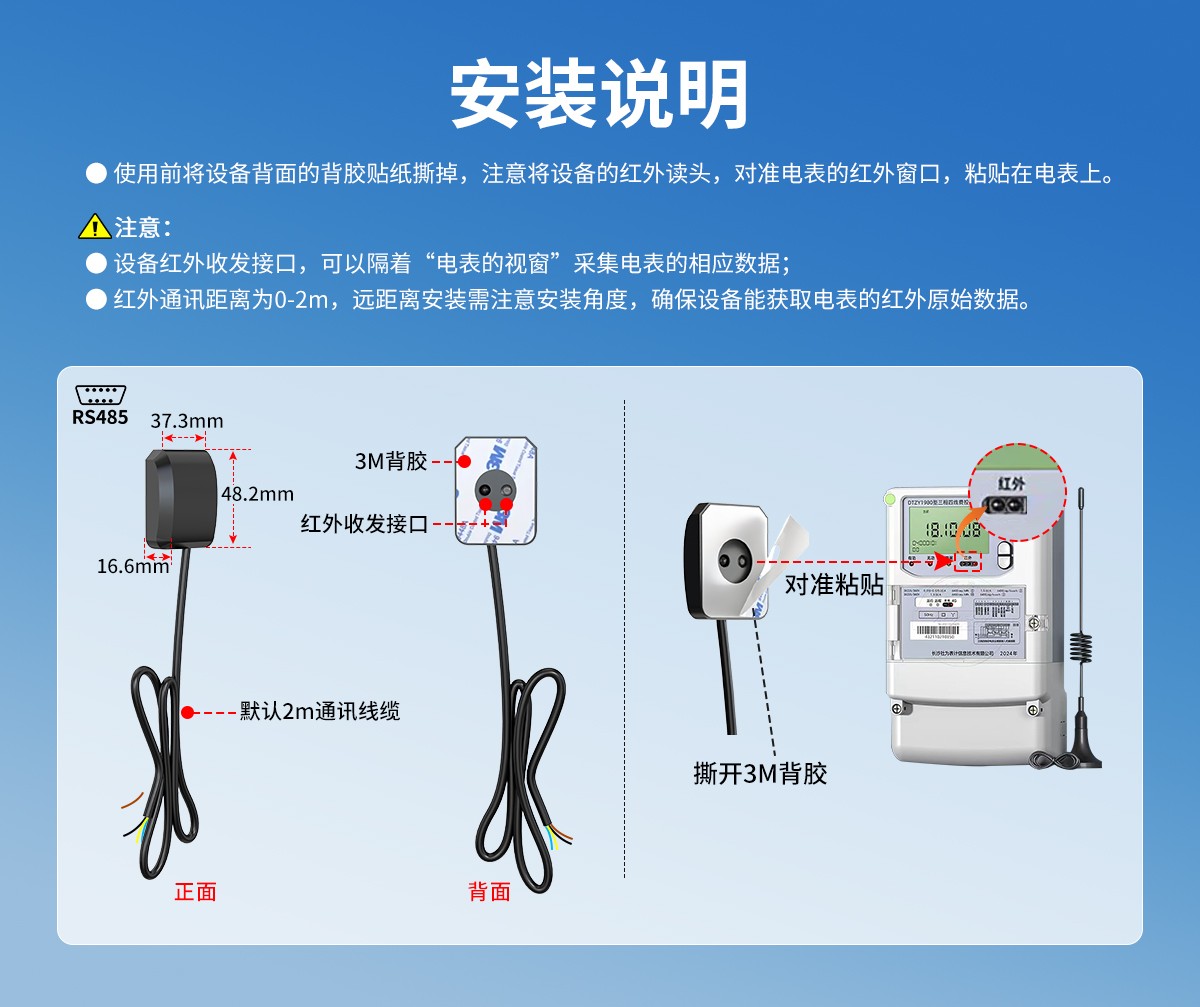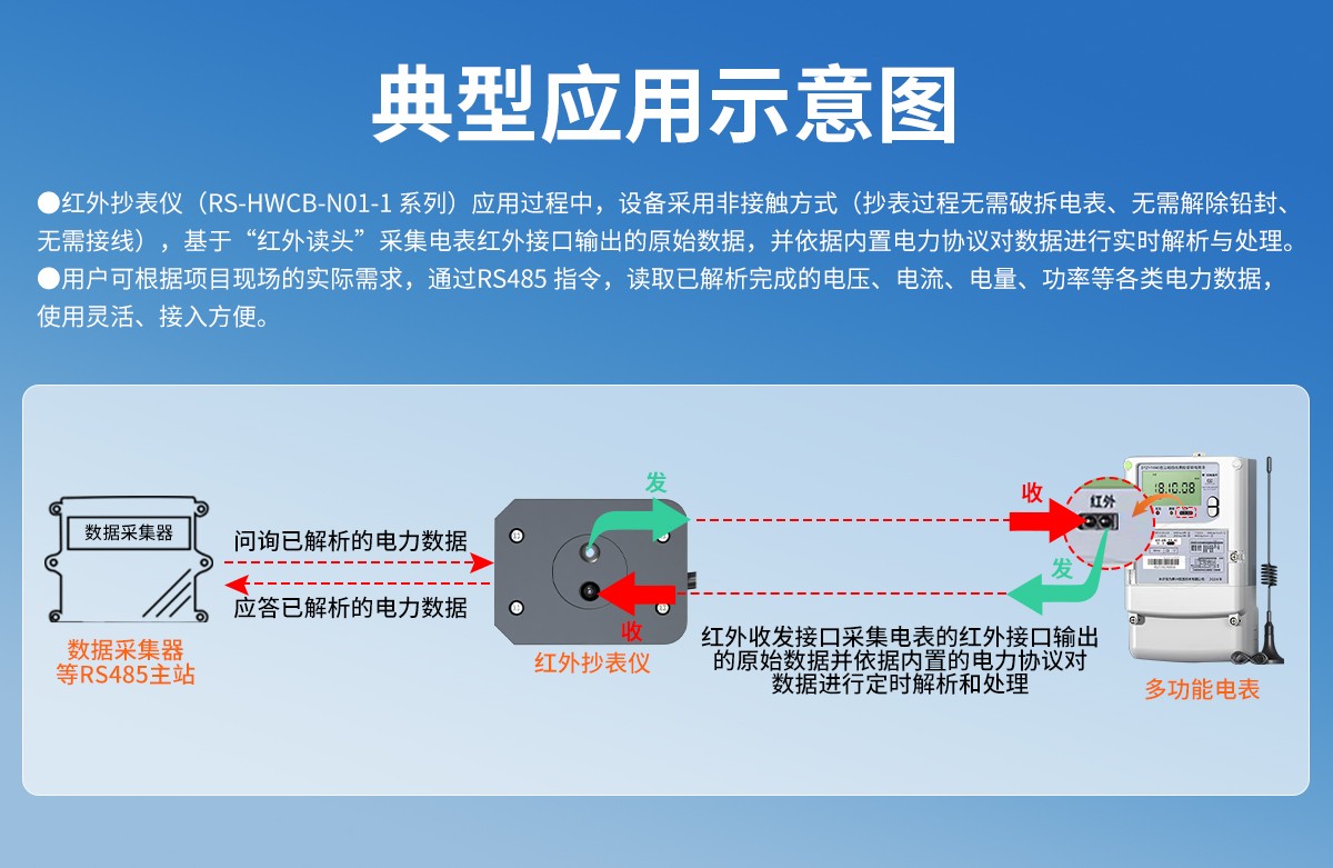 內置專用紅外讀頭,集成“DL/T645-1997、DL/T645-2007、DL/T698.45-2017”等多種主流電力通信規約。采用“非接觸紅外方式”,無需破拆電表、無需解除鉛封、無需接線,即可快速、穩定、精準讀取電表數據紅外接口輸出的原始數據,并依據內置電力協議對數據進行實時解析與處理。