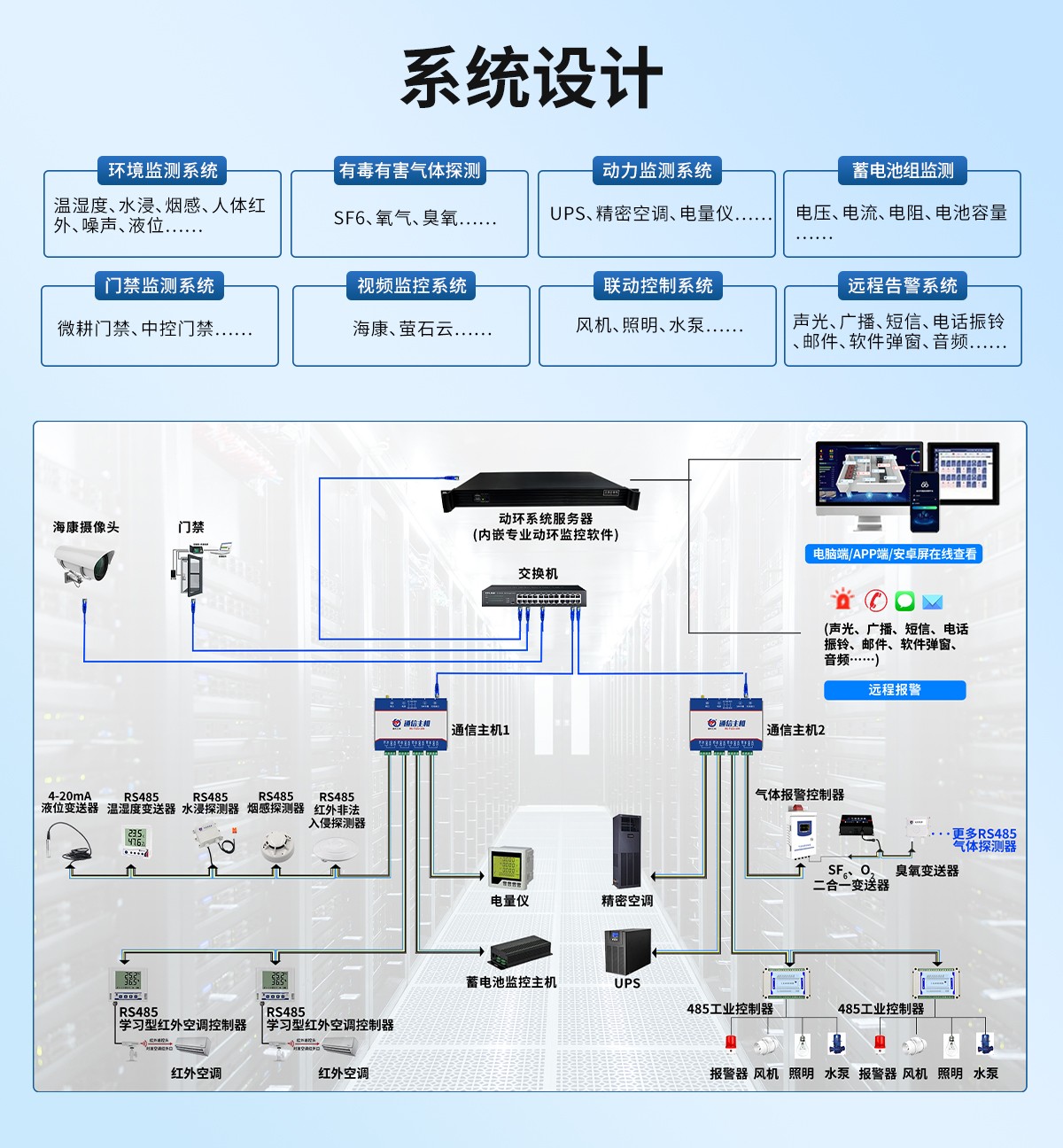 動環監測系統通過智能化監測手段,對機房/檔案館/配電室等場合的動力系統、環境系統、安防系統、門禁系統、視頻系統”進行集中監測及遠程控制。通過長期、穩定、不間斷的運行監測,實現異常情況及時告警、記錄,提前預知事故風險,從而保障監測場合的正常運維,提高管理水平,減少事故發生。