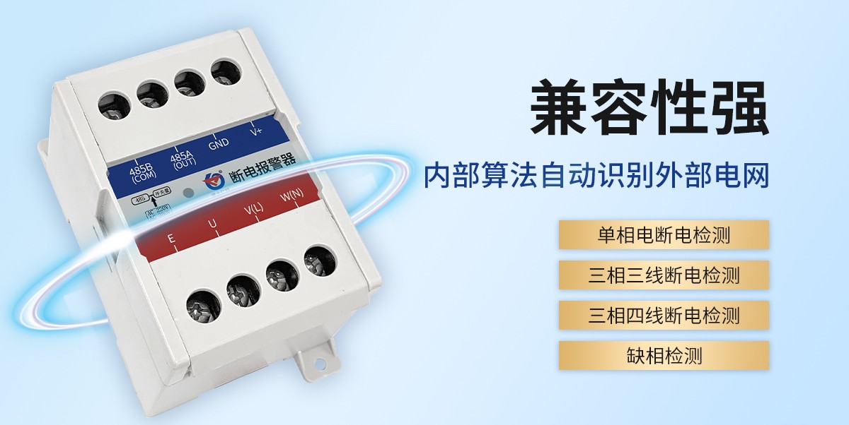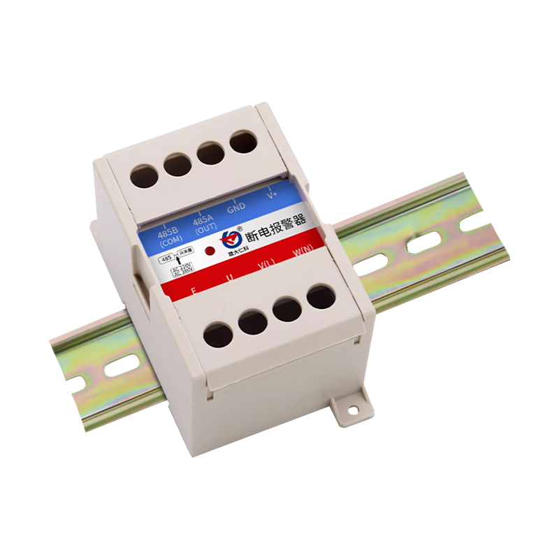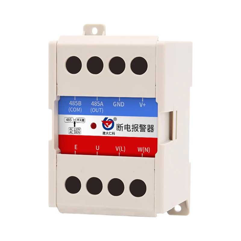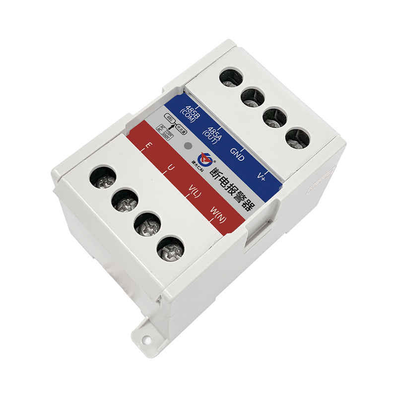 該報警器能夠進行單相電斷電檢測,三相三線、三相四線斷電及缺相檢測。報警信號可選485輸出,亦可選開關量干接點輸出??芍苯咏尤氍F場的PLC、工控表、組態屏或組態軟件。設備采用卡軌式外殼,即可壁掛安裝也可現場安裝于標準DIN35mm導軌。