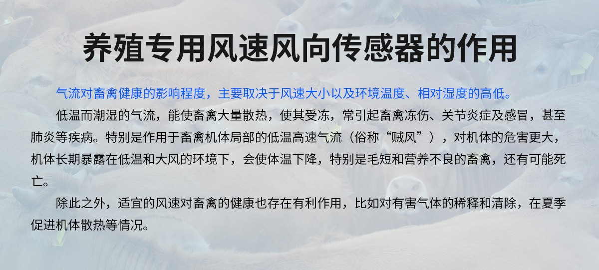 氣流對畜禽健康的影響程度,主要取決于風速大小以及環境溫度、相對濕度的高低。低溫而潮濕的氣流,能使畜禽大量散熱,使其受凍,常引起畜禽凍傷、關節炎癥及感冒,甚至肺炎等疾病。通過對養殖場內的風速要素進行實時監測與調控,為養殖場內動物提供更為舒適、健康的生長環境。