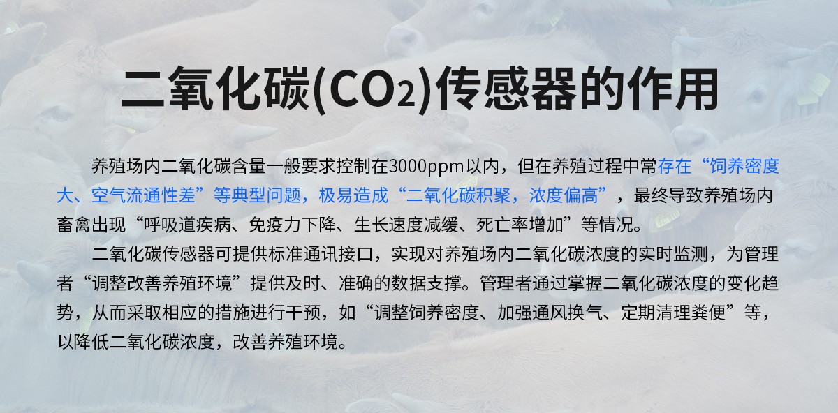 二氧化碳傳感器可提供標(biāo)準(zhǔn)通訊接口,實(shí)現(xiàn)對(duì)養(yǎng)殖場內(nèi)二氧化碳濃度的實(shí)時(shí)監(jiān)測,為管理者“調(diào)整改善養(yǎng)殖環(huán)境”提供及時(shí)、準(zhǔn)確的數(shù)據(jù)支撐。管理者通過掌握二氧化碳濃度的變化趨勢,從而采取相應(yīng)的措施進(jìn)行干預(yù),如“調(diào)整飼養(yǎng)密度、加強(qiáng)通風(fēng)換氣、定期清理糞便”等,以降低二氧化碳濃度,改善養(yǎng)殖環(huán)境。
